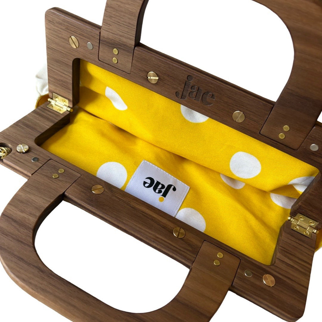 We recommend that you tighten the brass button/screws and hinges periodically as you might do with cabinet hardware. *Even though the solid, natural wood used in our products is fashioned into handles and covered with a matte lacquer finish, it’s living, breathing material that responds to the environment around it. Wood can expand and contract with changes in humidity and change color over time with exposure to air and sunlight. This results in very natural, beautiful changes over time. We recommend storing our handbags out of direct sunlight in order for both the woods and fabrics to maintain original quality and hues.