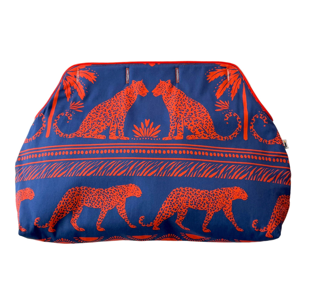 Designed for use with any of our handbag handles and the Medium Liner (sold separately). “Reupholster” your jae Bag by buttoning on our Exotic Getaway Medium Slipcover finished with piping. Whether you're off to the islands, the desert or planning a staycation, make your ensembles pop with these jewel-toned leopards. This vibrant slipcover reverses to orange cotton: use it with other bold-patterned outfits!