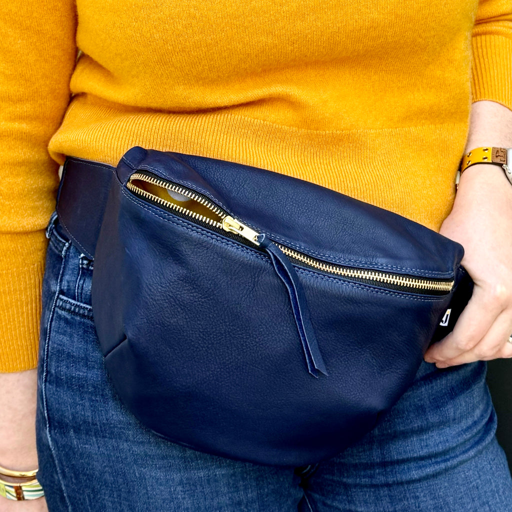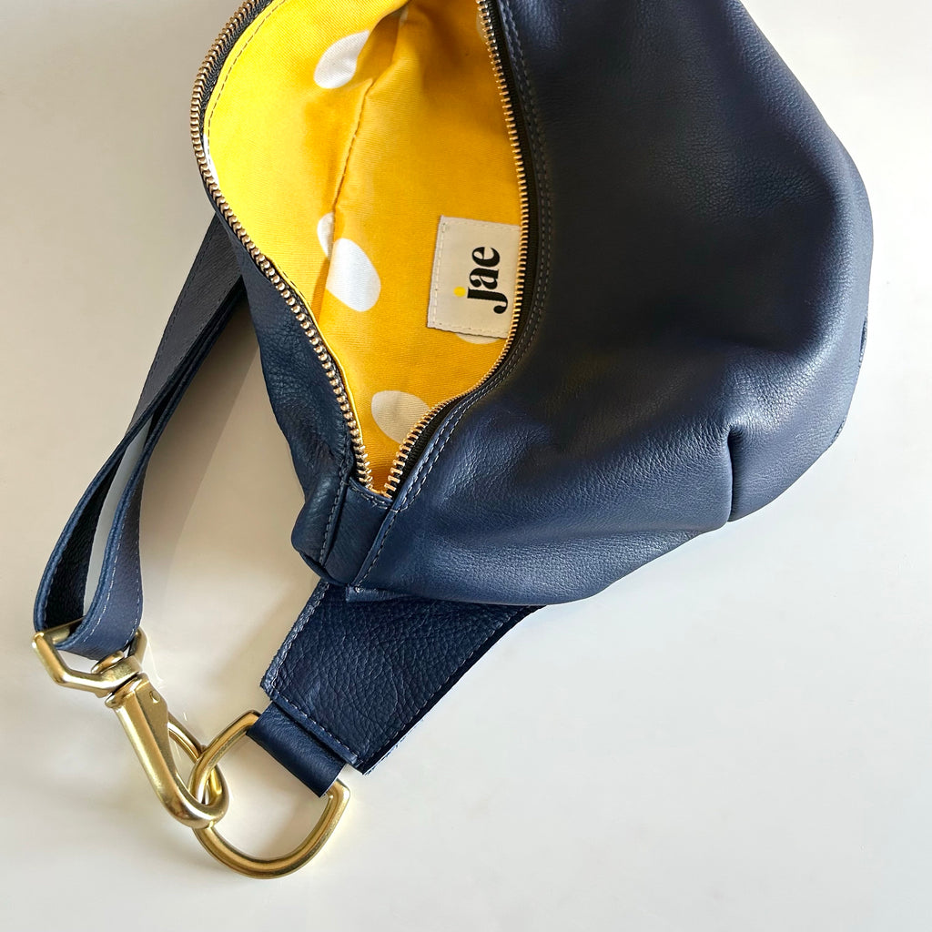 The jae Sling (aka, fanny pack): a roomy, soft leather sack you can sling over your shoulder or wrap around your waist. The strap is adjustable and features chunky, solid brass hardware. Open the brass zipper to reveal a lining made from our happy, signature Dottie fabric – a lightweight cotton twill. Zipper features a leather pull tab. Handcrafted in Southern California.