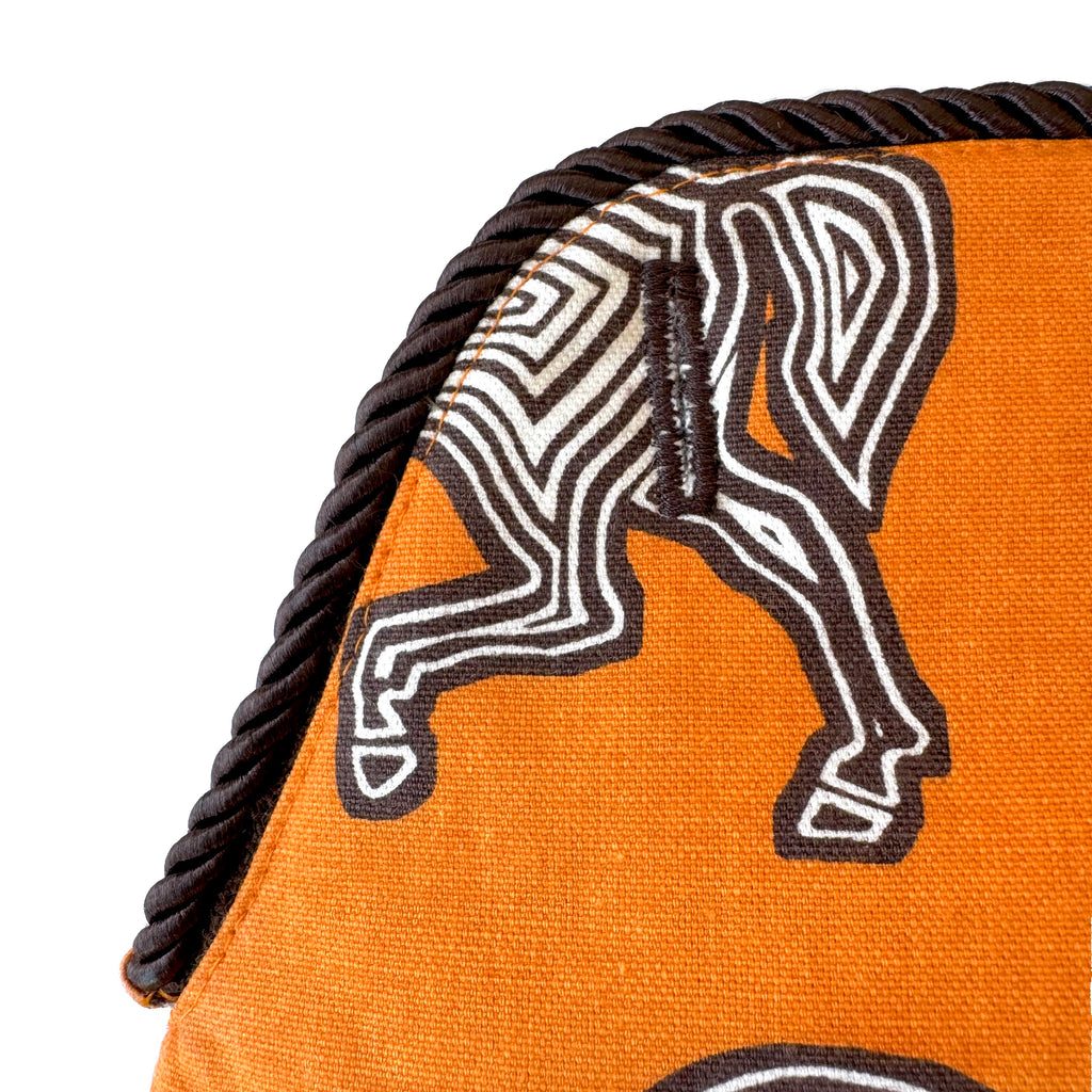 The Shortie Slipcover measures 14 1/4" wide x 7 1/2" high. A layer of batting between the inner and outer fabrics provides added structure. Horses: 100% cotton; brown twill 100% cotton. Cord trim: 100% polyester. Dry clean.