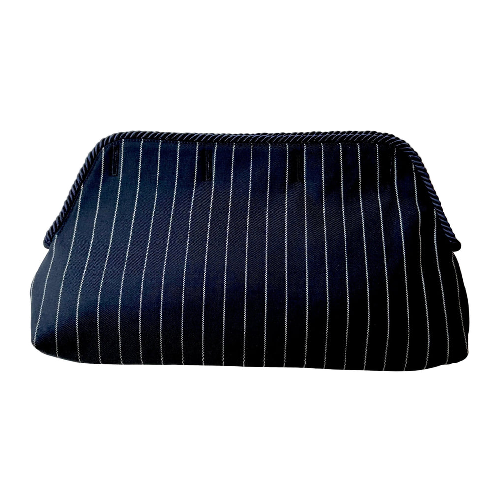 Designed for use with any jae handle and the Shortie Liner (sold separately). Our Pinstripes Shortie Slipcover evokes classic suiting: navy pinstripes in lightweight Italian wool with coordinating navy twisted cord piping. Turn it inside out for a black satin: day-to-night dressing, and add a vintage brooch!