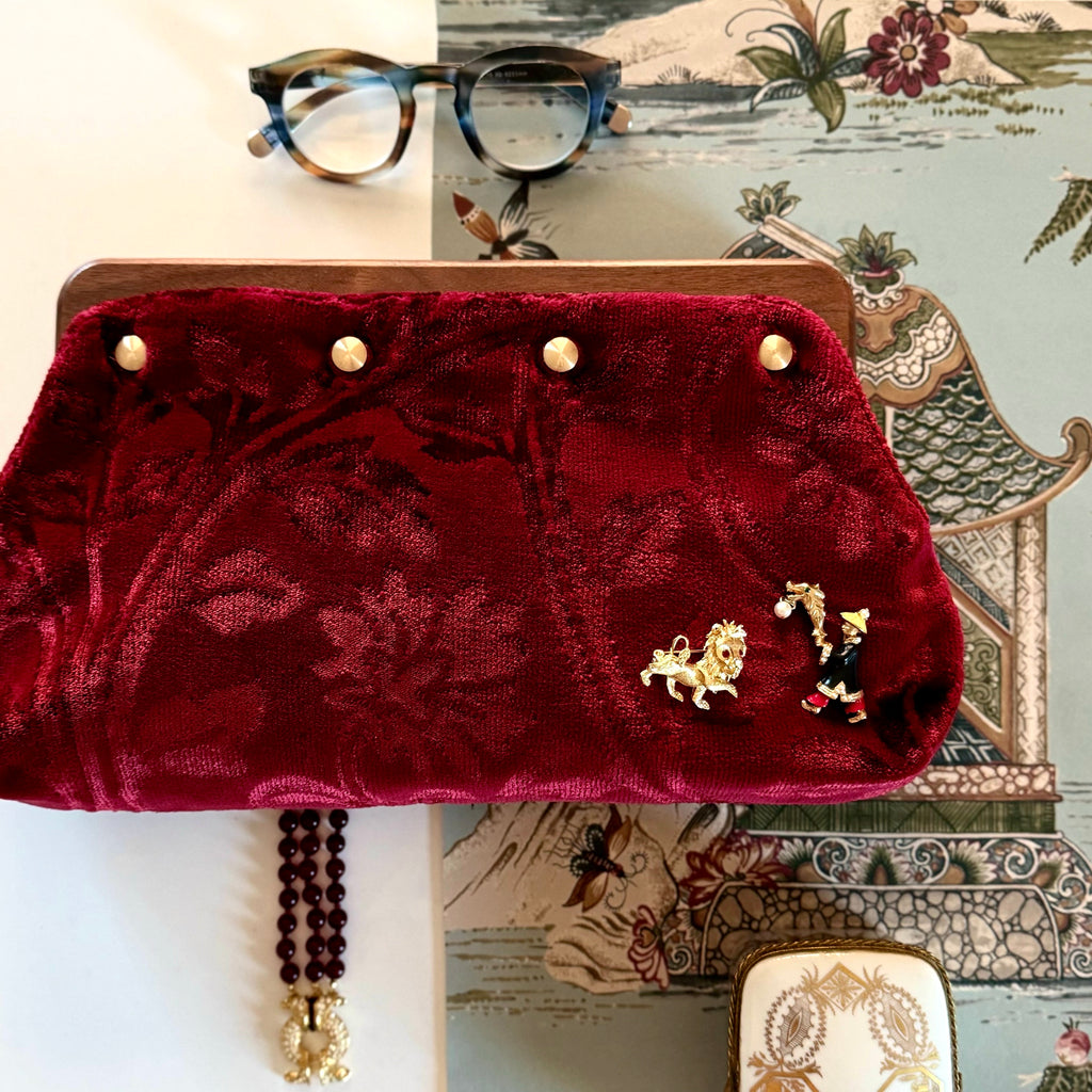 Designed for use with any of our handbag handles and the Shortie Liner (sold separately). “Reupholster” your bag by buttoning on the Del Mar Shortie Slipcover. This beautiful burgundy jacquard velvet is from Pindler's Hearst Castle Collection. This Slipcover is named for the design that inspired the pattern: the iron work on the front entrance of Casa Del Mar at William Randolph Hearst’s estate in San Simeon, California. (Handbag handle, liner and strap, and other accessories pictured are not included.)